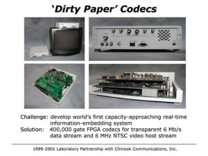 The foundations of information embedding were laid more than twenty years ago with early information-theoretic work on the problem of channel coding with side information at the encoder. One of those early papers was Costa’s whimsically titled “Writing on Dirty Paper”. In recent years, four key advances have made possible the development of practical information embedding systems. First is the recognition that the information embedding problem can be cast as a problem of “writing on dirty paper”. Second, is the development of practical code constructions in the form of distortion-compensated quantization index modulation (DC-QIM). Third is the development of capacity-approaching turbo codes with very low complexity iterative decoding algorithms. And fourth is the maturation of VLSI technology and the associated development tools. In this project, all four of these advances are exploited together in the design of the world’s first real-time, capacity-approaching information embedding system: the “dirty paper” coder/decoder (codec). This system transparently embeds a bitstream at 6 Mb/s into an arbitrary analog NTSC television signal so that it can be reliably transmitted through, for example, any FCC-compliant cable network. Such systems could be used to add roughly 300Mb/s additional downstream capacity to cable infrastructure without requiring plant upgrades or affecting existing services. The system operates within a couple of dB of capacity, and the reference design is complete with an analog front end, 400k gate FPGA codec, full DSP-based software equalization, and an embedded Linux controller. Other emerging applications of this technology include multi-antenna downlink transmission in wireless systems.